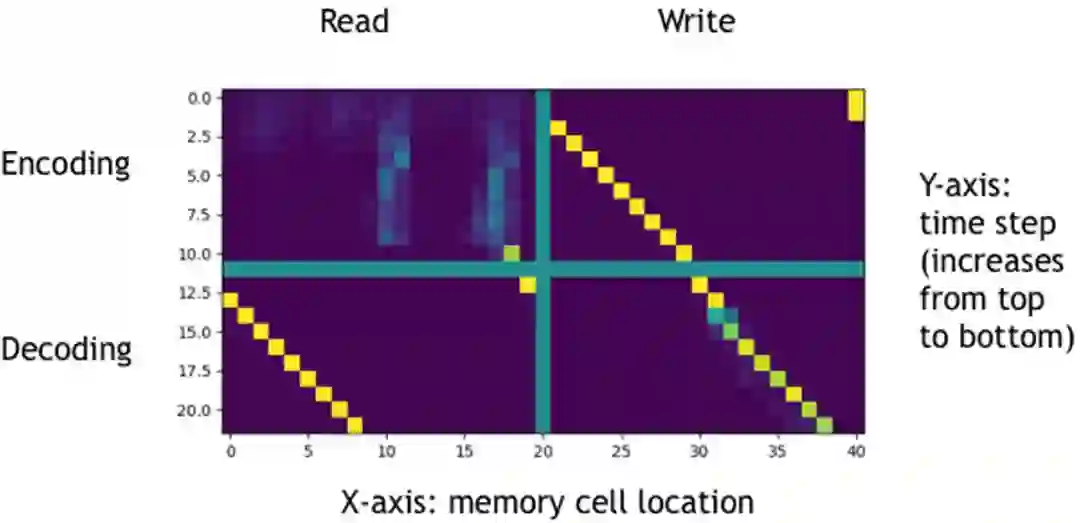 上图中横坐标为存储单元的位置,纵坐标为时刻(从上至下时刻递增),使用绿色线分隔得到的四张图的上边两张对应编码阶段,下边两张对应解码阶段,左边两张和右边两张分别对应读和写,图中像素点约接近黄色代表强度越大。进过分析,可知NTM在拷贝任务上学习到的策略为: