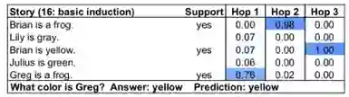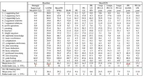 每一列代表一个样本,黑色字体的句子为已知事实,蓝色字体的句子为问题,红色字体标出的是答案。解决这类问题的一般策略为根据答案在已知事实中逆向回溯寻找答案(backward chaining,回退式链式推理)。下表给出各个模型的准确率对比: