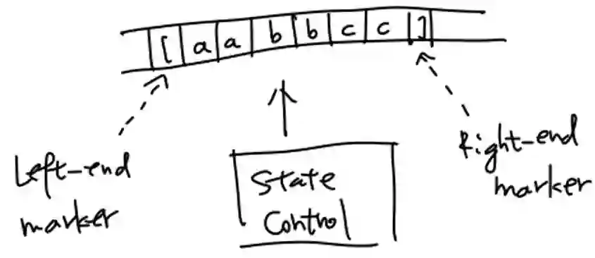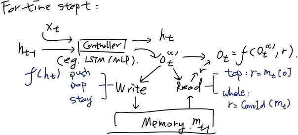 ;存储模块可以是各种数据结构组织的模型(如栈、队列或者是一个可随机访问的数组),类比于各种自动机的存储模块;读写机制则与存储模块的数据结构类型相一致。最后每一时刻都经过一个输出函数f,将控制器输出