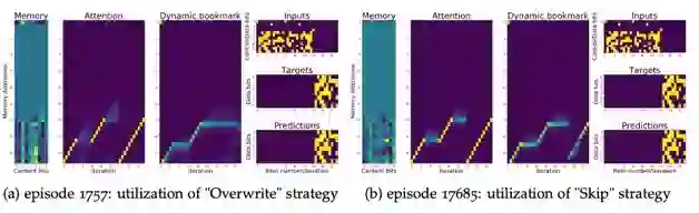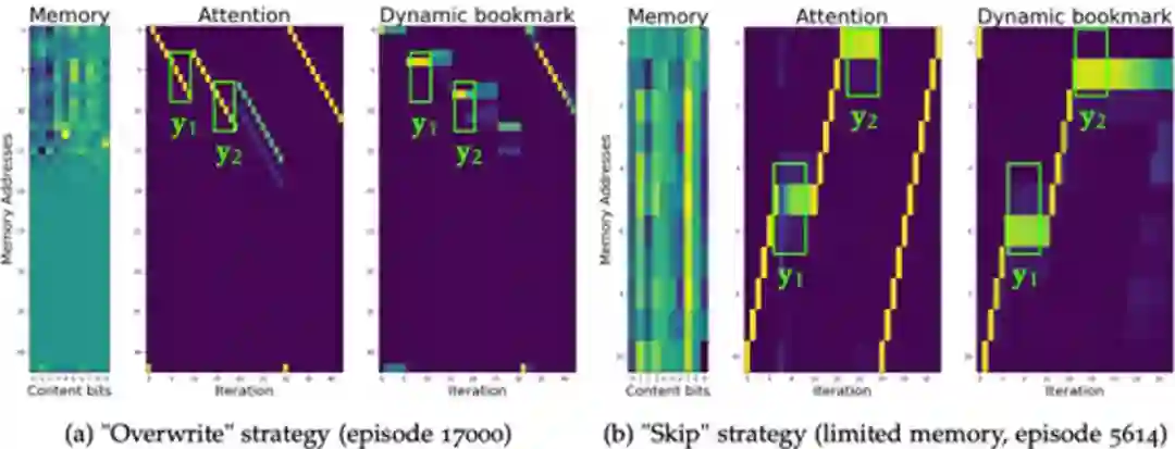 而实际实验中发现这两种策略都是可以学习到的。从而一个自然产生的问题就是如何让模型学到特定规则,而实验发现,模型在训练初期往往会学习到覆盖策略(由于这样的策略较简单,容易学习到),在训练的后期会逐渐转为略过策略(由于这种策略能更佳高效的利用存储空间),两个阶段(episode 1757与episode 17685)的策略可视化如下图所示: