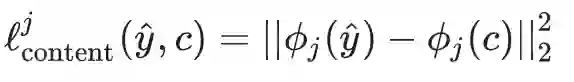 形式上,令 y^ 为生成的图像,并令 ϕj(x) 为输入 x 的 第 j 层特征映射。相应的内容损失可以被计算为: