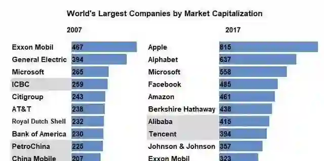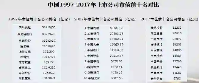 再看中国1997年到2017年每十年我们做这样的一个分析,最大的市值企业,1997年是四川长虹,到2007年发生变化,中国石油,在2007年的11月份,它的市值到过1万亿美金,但是没太久,到2017年大家看到的就是这个数字企业排名发生很大的变化,排名第一第二的企业在这个比排行榜的起始年份还没有诞生,20年后它是中国最大的市值企业,虽然在海外上市,我们到2028年的时候我们再看这个图的时候,我相信我们会看到很多完全不一样的企业,可能来自不同的行业,大家也可以想像得出来。