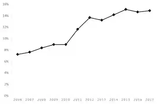 所以说这个给大家简单的看一个图示,我们看到中国人比较喜欢讲的《财富》全球500强企业,这是财富杂志每一年的7月份根据这个企业销售收入,做的一个全球排名,中国企业在1996年有2家企业进去,到2017年去年是109家,到今年的话是111家,如果把台湾企业加进去我们是121家,美国126家,按照这样的数据的话中国有可能在未来两年左右超过美国,下面这条线会超过上面的这条线。