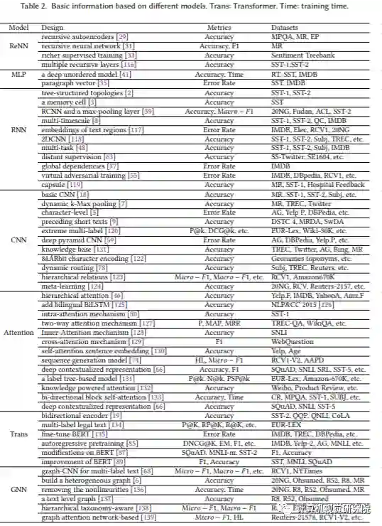 •在表1中介绍了文本分类的过程和发展,并根据出版年份总结了经典模型的必要信息,包括场所,应用程序,引文和代码链接。