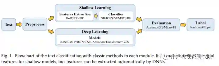 主要文本分类方法的示意图如图2所示。从1960年代到2010年代,基于浅层学习的文本分类模型占主导地位。浅层学习意味着基于统计的模型,例如朴素贝叶斯(NB),K近邻(KNN)和支持向量机(SVM)。与早期的基于规则的方法相比,该方法在准确性和稳定性方面具有明显的优势。但是,这些方法仍然需要进行功能设计,这既耗时又昂贵。此外,它们通常会忽略文本数据中的自然顺序结构或上下文信息,这使学习单词的语义信息变得困难。自2010年代以来,文本分类已逐渐从浅层学习模型变为深层学习模型。与基于浅层学习的方法相比,深度学习方法避免了人工设计规则和功能,并自动为文本挖掘提供了语义上有意义的表示形式。因此,大多数文本分类研究工作都基于DNN,DNN是数据驱动的方法,具有很高的计算复杂性。很少有研究专注于浅层学习模型来解决计算和数据的局限性。