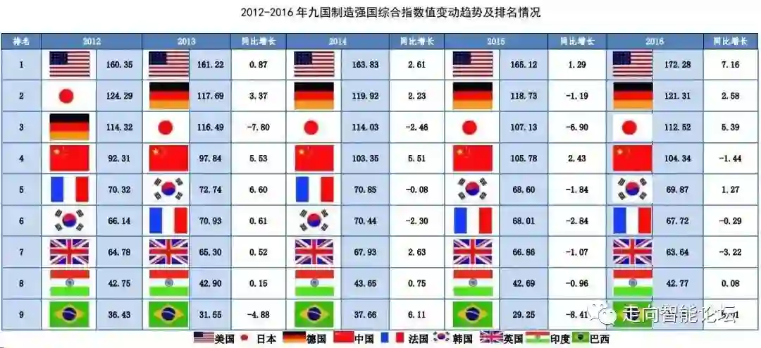 2、2012—2016年中国指数值增长最大,符合制造强国战略预期。