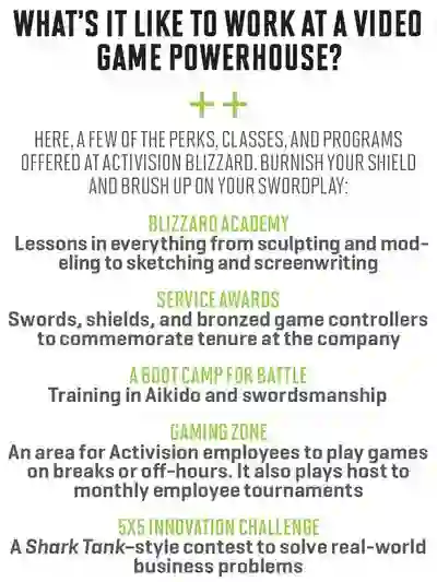 因为这里有加州著名娱乐王国——动视暴雪(100家最适合工作的公司榜单排名第84)旗下暴雪娱乐王国所在地。缓缓打开的安全门后,是世界上众多职场人士的梦想圣地。