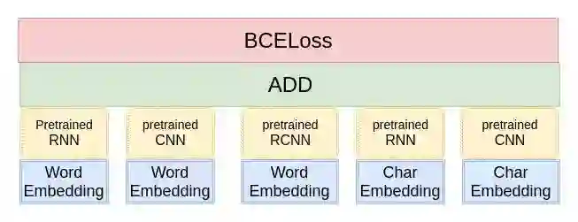 从第一行和第二行的对比之中我们可以看出,模型差异越大提升越多(RNN 和 RCNN 比较相似,因为他们底层都采用了双向 LSTM 提取特征),虽然 RCNN 的分数比 Inception 要高,Inception 对模型融合的提升更大。