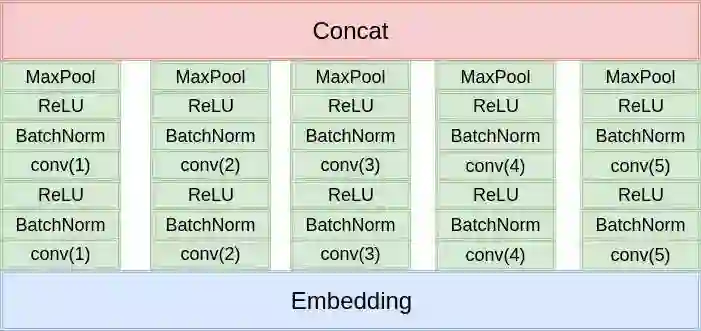 这个是我自己提出来的,参照 TextCNN 的思想(多尺度卷积核),模仿 Inception 的结构设计出来的,一层的 Inception 结构如下图所示,比赛中用了两层的 Inception 结构,最深有 4 层卷积,比 TextCNN 更深。
