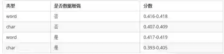 训练的时候,每个模型要么只训练基于词(word)的模型,要么只训练基于字(char)的模型。各个模型的分数都差不多,这里不再单独列出来了,只区分训练的模型的类型和数据增强与否。