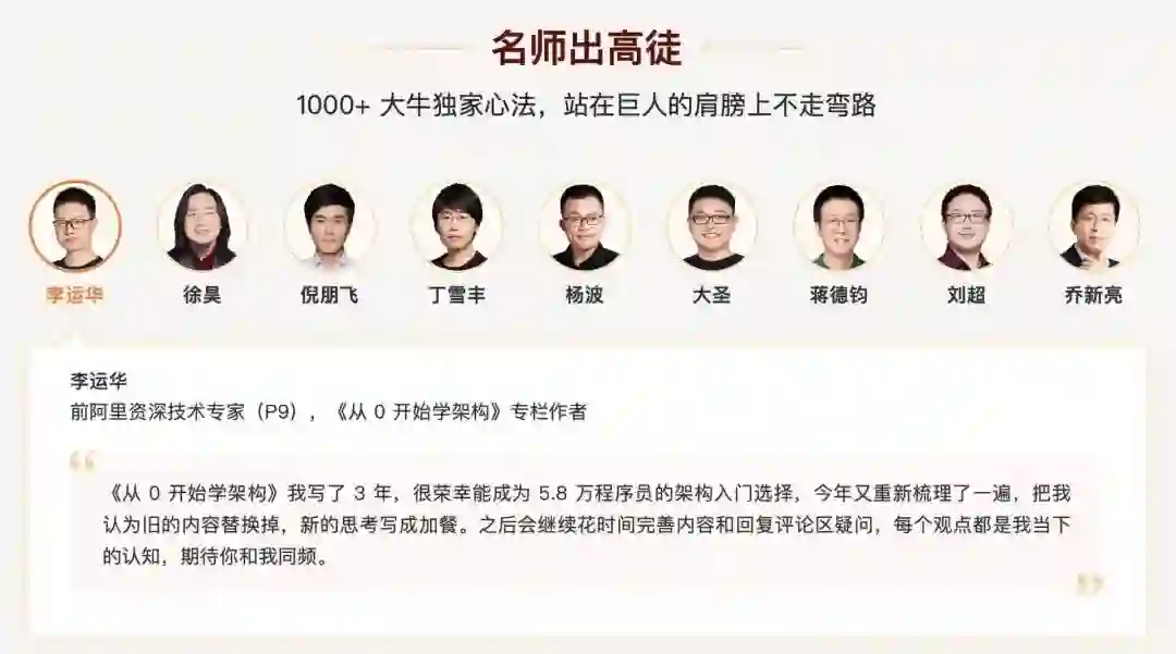 目前已经上线了好几门备受好评的大师课,比如对话汤峥嵘(前阿里 P10 )、对话张雪峰(前饿了么 CTO )、徐昊( Thoughtworks 中国区 CTO )的业务建模、许式伟(七牛云 CEO )的架构课、乔新亮(前苏宁副总裁)的成长复盘等,你可以随时在专栏的留言区和交流群跟各位大牛老师交流,而且未来还有更多阿里 P10 级别的大师加入进来。