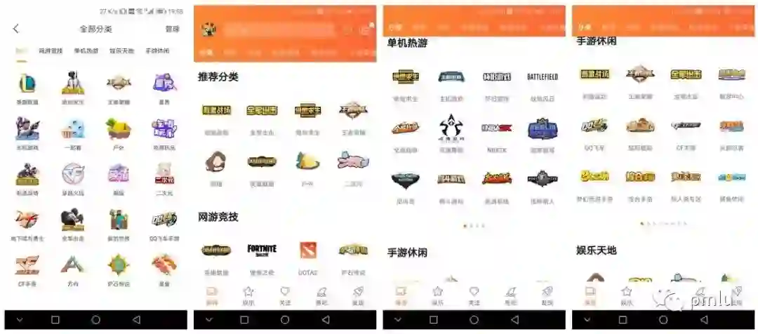 第二个页面为娱乐,这一个页面中的功能则与电子游戏关系不大,顶部的标签为二次元,颜值,户外等。上下两张图片中的内容也没有什么实质性的区别。