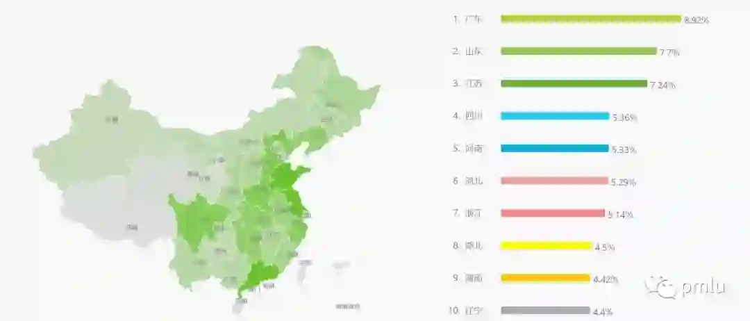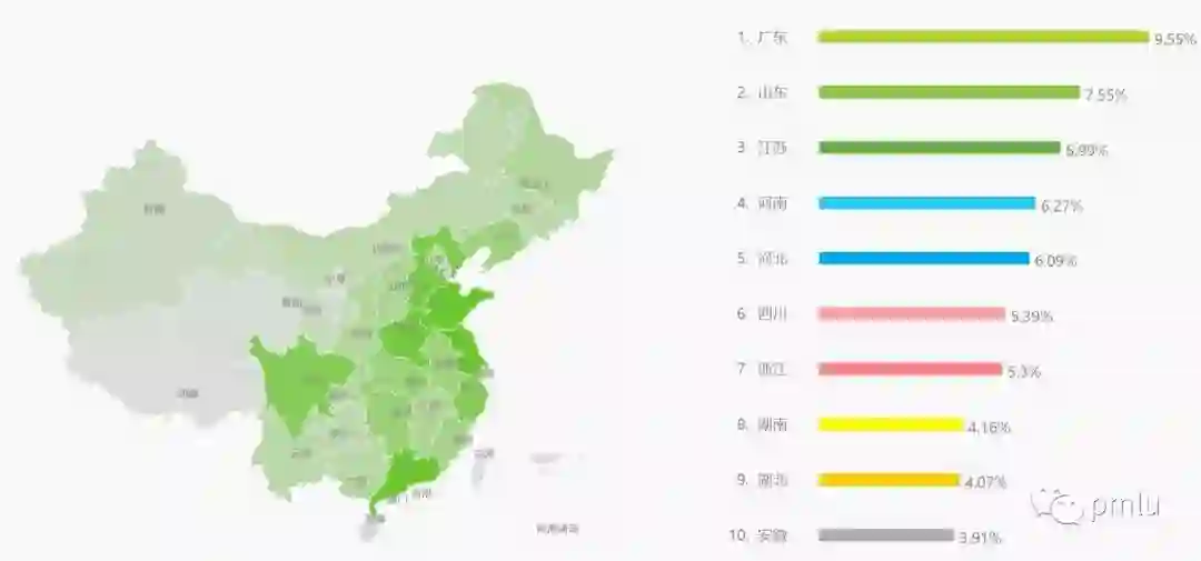 两者地域分布中的前三都是一致的,虽然后面的顺序有区别,但总体看来几乎是一致的。