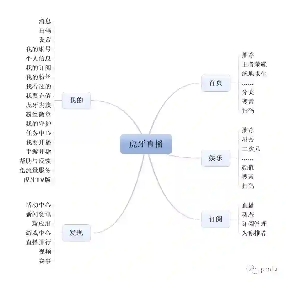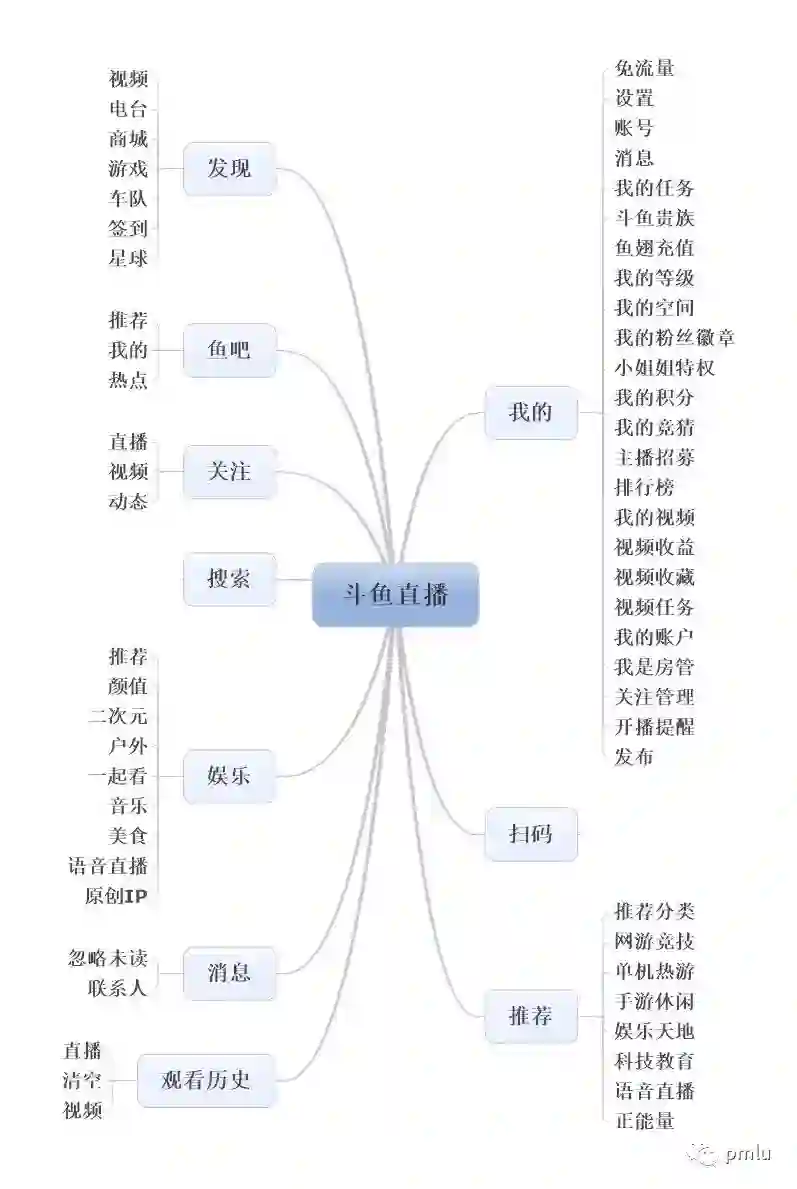 斗鱼直播的产品结构图如上所示,总的来说有一个特点是一级标签非常多。我的,扫码,搜索,历史,消息都作为一级标签而存在。这种设计是很少见的,作者个人并不是很喜欢这种设置方式。过多的一级标签会让层次混乱,界面重复度高,且使用也没有方便多少。
