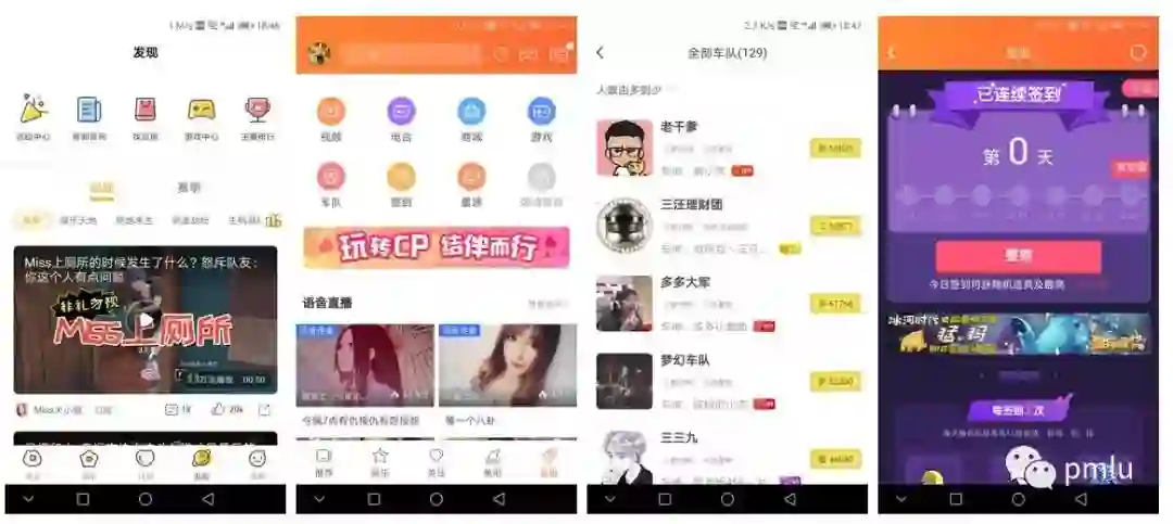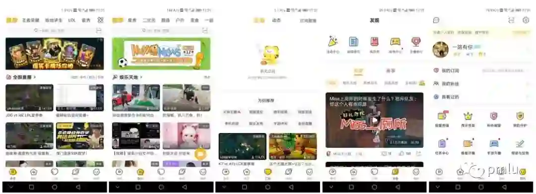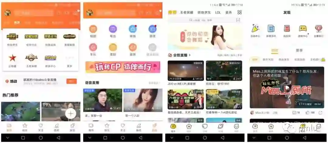 上图中为两者的发现页面对比,左一是虎牙,其它为斗鱼。可以发现虎牙依然是较为精简的,虎牙有的内容斗鱼基本都有,而斗鱼则多出了不少功能。例如车队,星球,签到。
