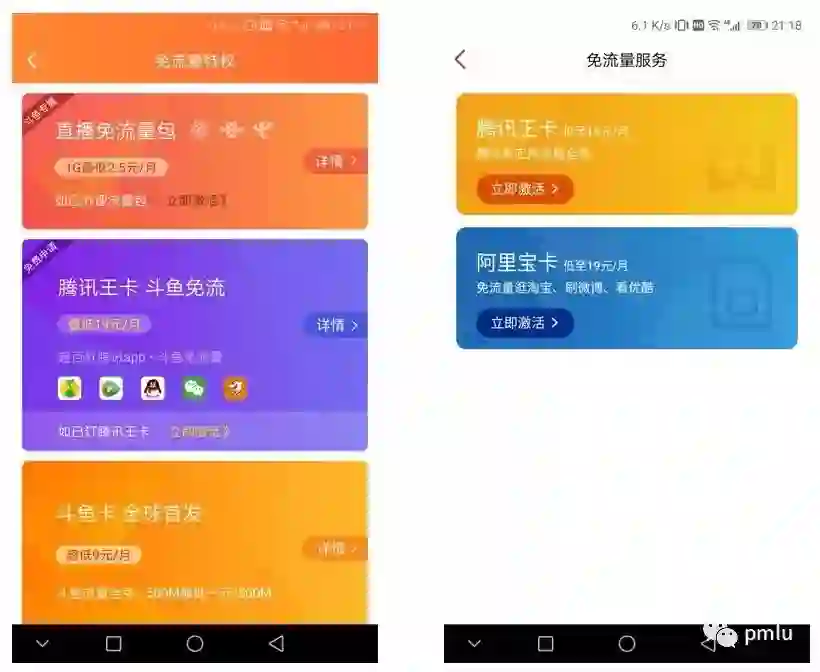 上图是两个软件的流量解决方案,都是通过购买免流量服务来实现的,其中斗鱼提供的服务种类要稍微多一些,而虎牙则相对少一点。腾讯王卡虽然可以对腾讯系的所有产品免流量,但价格稍贵。