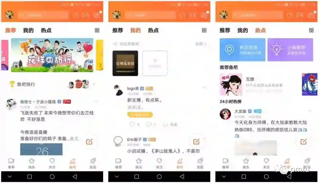 鱼吧有推荐,我的,热点三个模块。