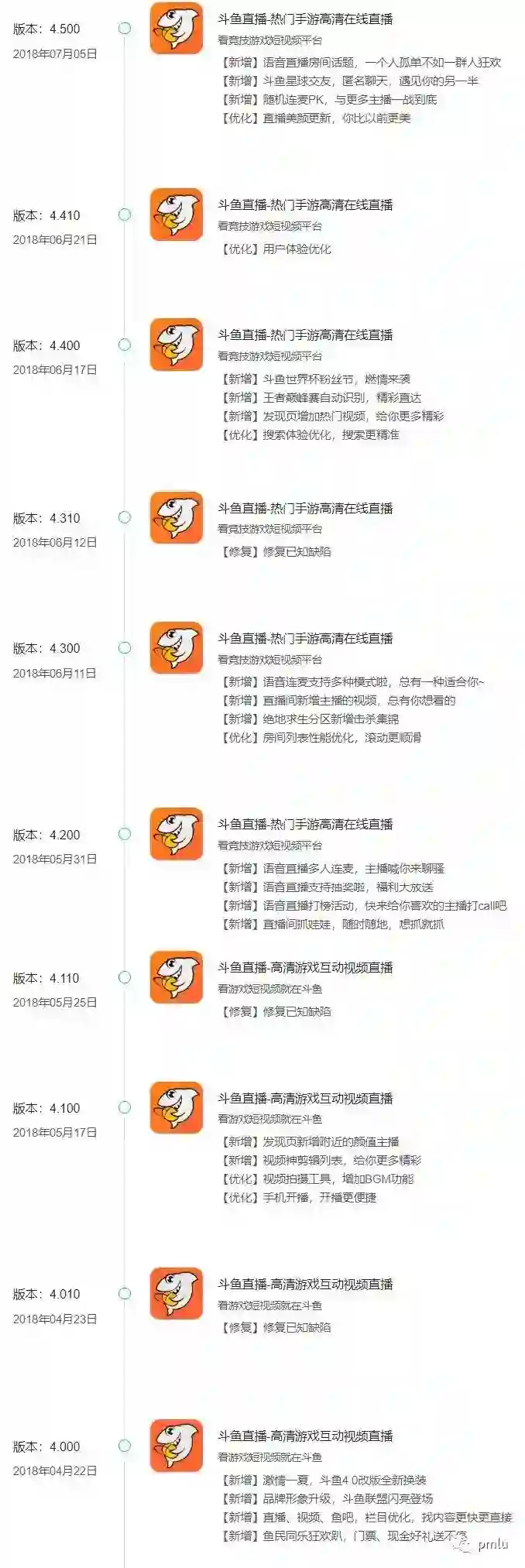 斗鱼的近十次更新如上图所示,时间跨度从4月22日到7月5日。在不到两个半月的时间里更新了10次,平均每周就要更新一次了,这个速度还是很快的。