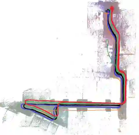 图3为不同方法在不同环境下表现的定性对比结果。其中蓝色线条表示LI-SLAM、橙色线条表示ORB-SLAM、绿色线条表示ORB-LI-SLAM、红色线条表示VLI-SLAM。