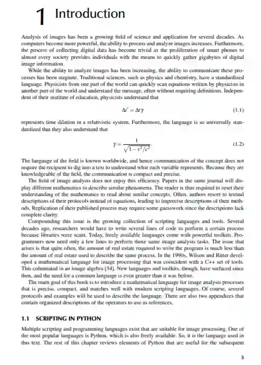 几十年来,研究人员一直在开发操作和分析图像的算法。由此,在许多高级编程语言中出现了一组常见的图像处理工具。虽然用于图像分析的库正在合并为一个通用的工具包,但图像分析语言仍然停滞不前。通常,分析协议的文本描述比执行进程所需的计算机代码消耗更多的空间。此外,文本解释有时是模糊或不完整的。这本书为图像处理领域提供了精确的数学语言。定义的操作符直接对应于标准库例程,极大地促进了数学描述和计算机脚本之间的转换。本文给出了python3的例子。