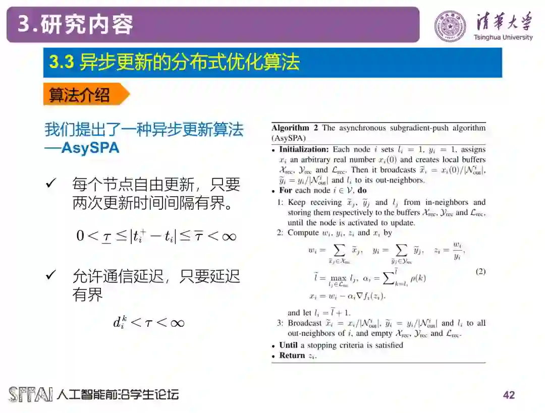 分布式优化算法是目前的一个研究热点,且随着单硬件计算能力发展放缓,采用多硬件加速网络的训练会越来越成为以后的主流。在这种情况下,如何设计分布式的算法,保障其收敛性,加快其收敛速度,是一个值得研究的理论问题。本文介绍了目前分布式算法的一些基本概念和研究现状,以及我们提出的一种异步算法AsySPA。总之,分布式优化目前还有很多理论问题需要研究,并且如何跟具体的应用问题结合也是一个重点和难点。