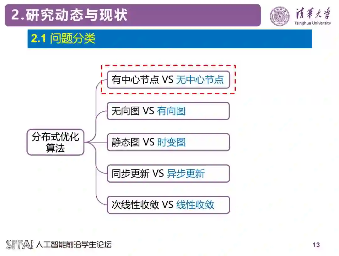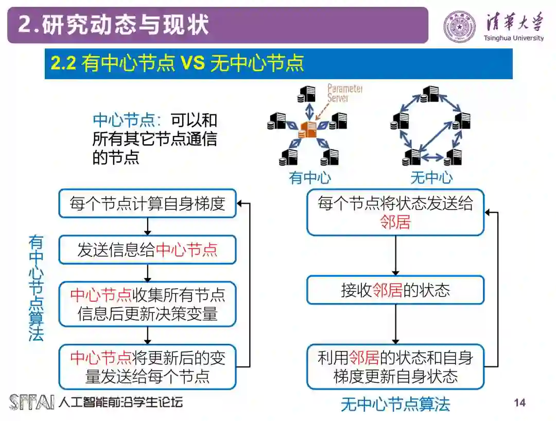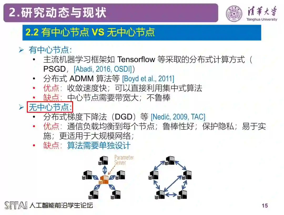 目前很多机器学习上采用的分布式优化方法,包括Tensorflow等框架,采用的都是有中心节点式的分布式算法。而目前无中心节点的算法受到了广泛的关注,它们的关系和区别如下图所示。
