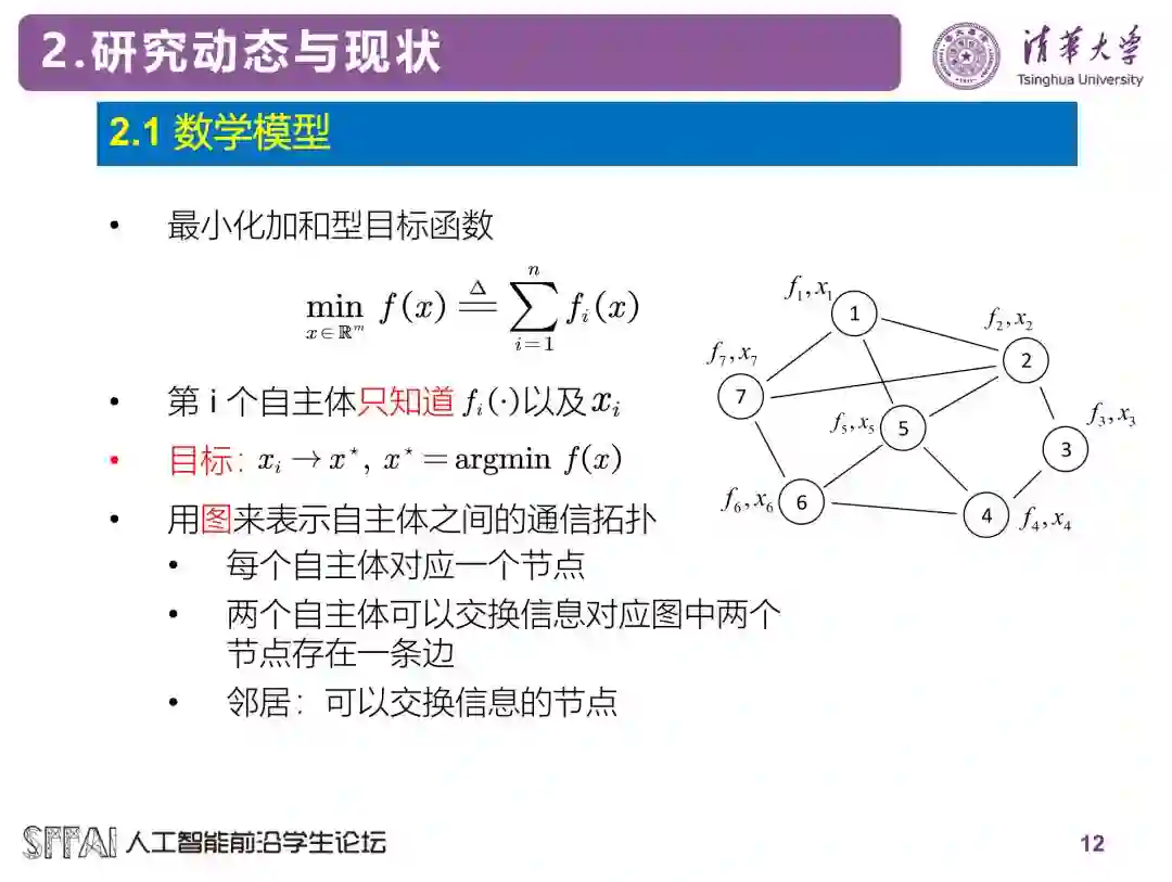 分布式优化问题并没有一个特别明确的定义,根据应用场景的不同具体的形式也有不同,但是主要思想都是采用多个节点来优化全局目标函数。这里的节点可以是CPU, GPU或者服务器,也可以是智能电网中的供电站,无人机编队中的一架无人机,传感器网络中的传感器等。每个节点都有着自己的局部目标函数(损失函数)以及决策变量,而全局目标一般是所有节点上的局部目标函数之和。分布式算法的目标就是通过节点间相互交换信息来使所有节点的决策变量最终收敛于全局目标函数的最小值点。以机器学习为例,分布式优化可以应用于利用多个服务器来优化一个神经网络,其中数据集分布在不同的服务器上,因此每台服务器只能获得一个局部的损失函数。优化算法需要服务器间不断的交换信息。