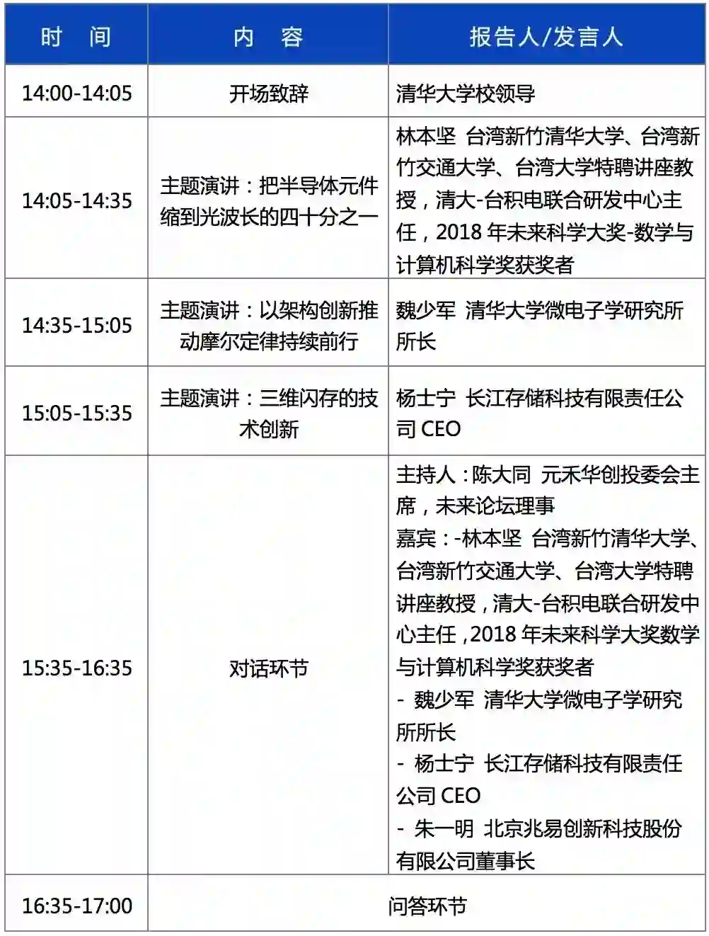 2018年11月19日,清华大学将联合未来科学大奖,特邀2018年未来科学大奖-数学与计算机科学奖获奖者、台湾新竹清华大学、台湾新竹交通大学、台湾大学特聘讲座教授林本坚和清华大学微电子学研究所所长魏少军,长江存储科技有限责任公司CEO杨士宁,北京兆易创新科技股份有限公司董事长朱一明举办未来科学大奖与清华大学联合学术报告会。未来论坛理事、元禾华创投委会主席陈大同将作为对话环节的主持人,与四位重量级嘉宾共同参与讨论。