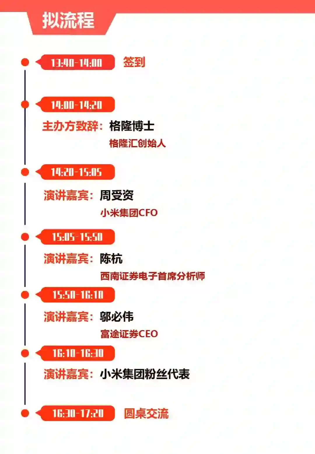 本期汇说我们邀请到小米集团-W(1810.HK)CFO周受资先生出席,港股同股不同权第一股,投资者们不容错过!除此,我们还请来一位在雷军旁见证小米上市历史时刻的“骨灰级”米粉-洪骏先生,现场分享小米自创立到上市,作为一名米粉的深切感受。而且,西南证券电子行业首席分析师陈杭先生亦将出席本期汇说,给投资者们分析小米的市场情况。