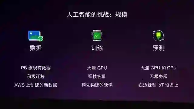 Vogel 也在演讲中表示,规模庞大、来源复杂的数据是人工智能领域面对的首要挑战,首先要对数据进行管理和处理,然后是使用 GPU 进行训练,最后在边缘设备上运行模型做出预测。