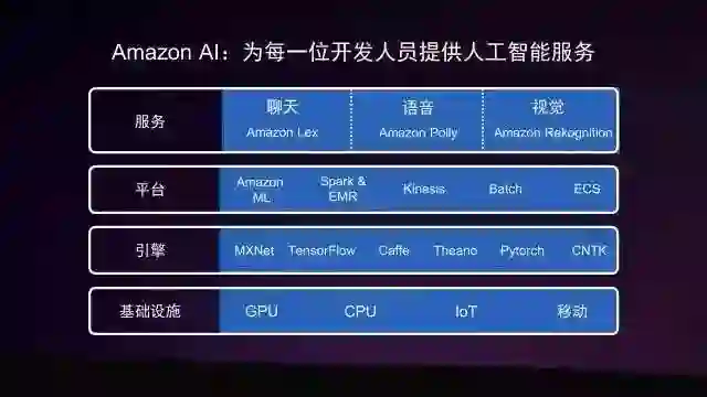7 月 27 日,2017 AWS 技术峰会北京站在国家会议中心举行,会上,容永康与亚马逊首席技术执行官 Werner Vogels 对 AWS 的业务进行了梳理,众多 AWS 的客户和合作伙伴也分享了他们使用 AWS 云服务的经验。人工智能作为一个对云计算有巨大需求的领域,作为 AWS 眼中未来十年的大趋势之一和近期投入大量资源的方向,也引发了广泛的关注和讨论。AWS 为人工智能领域提供了哪些产品?其优势体现在哪些方面?机器之能在采访了相关负责人及行业用户之后结合演讲内容进行了以下梳理。