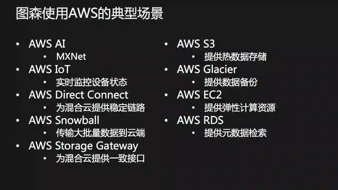 致力于自动驾驶领域的图森未来是开发者中的 AWS「重度用户」,其 COO 郝佳男在媒体沟通会上提供了近十种图森未来使用 AWS 的典型场景。他表示,AWS 吸引他的地方在于,当他按照需求构建架构时,可以像拼图一样从 AWS 的产品列表中找到合适的产品。