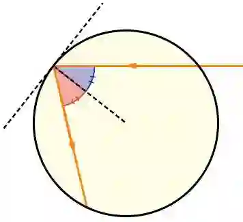 光线照射到圆形容器的边缘,会发生反射。假设阳光是平行光,让我们来观察一下反射光路:根据光的反射定律,反射角等于入射角,即反射光线与法线的夹角等于入射光线与法线的夹角,法线是圆在入射点上切线的垂线(图 1.4)。