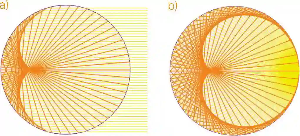 阳光视为平行光,照射到杯沿并经过反射后,汇集成的曲线就是所谓的“散焦线”,与所有反射光路相切。这里的散焦线和心形线很相似(图 1.5a)。