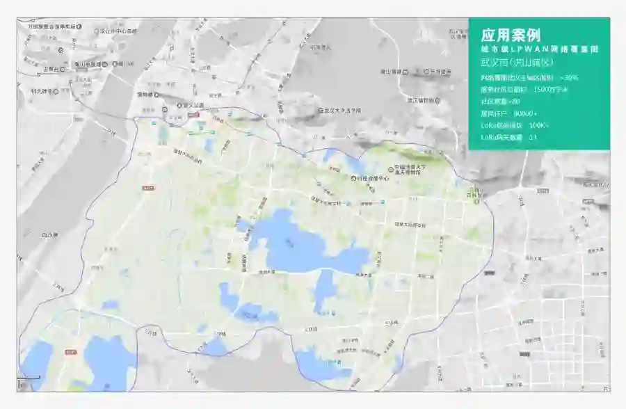 慧联无限在武汉市洪山区建成了省会级城市中心城区低功耗广域物联网平台,共建设了城市级基站13座,覆盖面积210平方公里,目前已实现了智慧消防、安防、停车、环境监测、物业管理等落地应用。