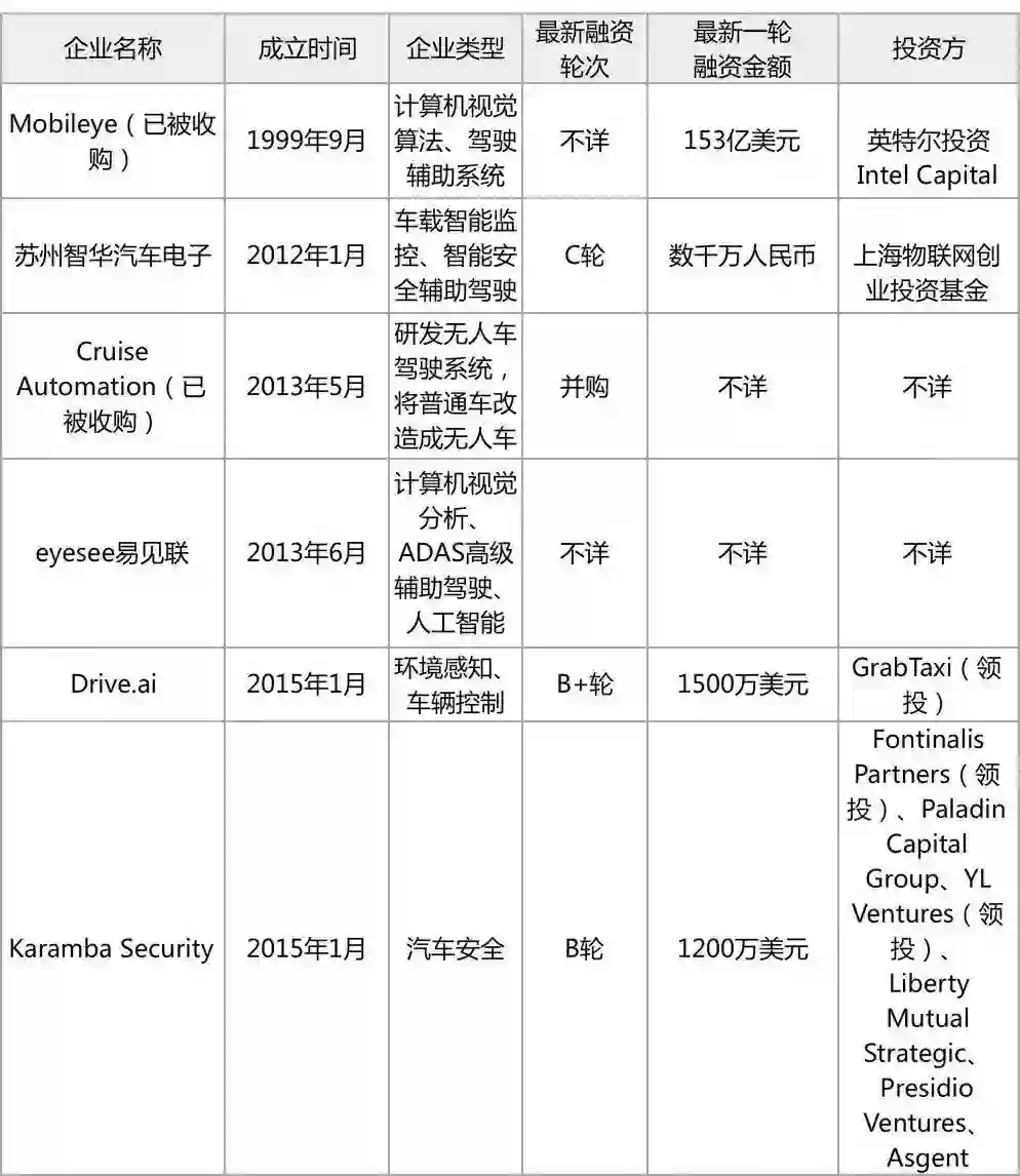 从成立时间上看,最早的无人车创业公司Mobileye成立于1999年。Mobileye公司成立之初,是想做汽车的眼睛,也就是帮助汽车建立视觉系统,识别周围障碍物,进而降低交通事故频次。