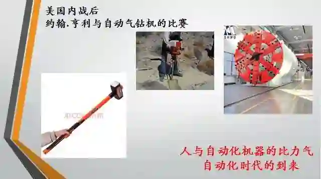 第一个图上面有三样东西,一个人拿着一个大铁锤,还有一根签子,钢钎。一百多年前,美国有一个叫约翰·亨利的人,是一个特别著名的大力士,他力大无比,穿山打洞的能力比任何工人都强、都著名。那个时代突然发明了一种气动机,这个大力士很不以为然,所以他就提出了挑战,做了一次人机大战。