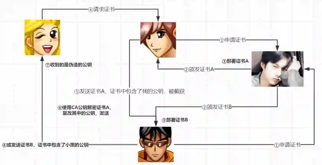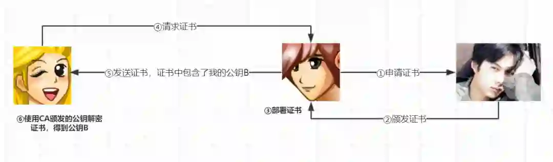 首先,每个同学在入学的时候,都会收到由学生会颁发的公钥A,而这个公钥A是绝对可信任的。以后,哪个同学谈恋爱了,需要串小纸条了,就到学生会小季处申请证书,证书将用于对你的公钥B进行加密,然后你将你的公钥B加密后传输给你的对象,因为他/她在开学之初已经收到了CA的颁发的公钥A,只要用这个公钥A来解密数据,若能解开,便能取出你的公钥B。