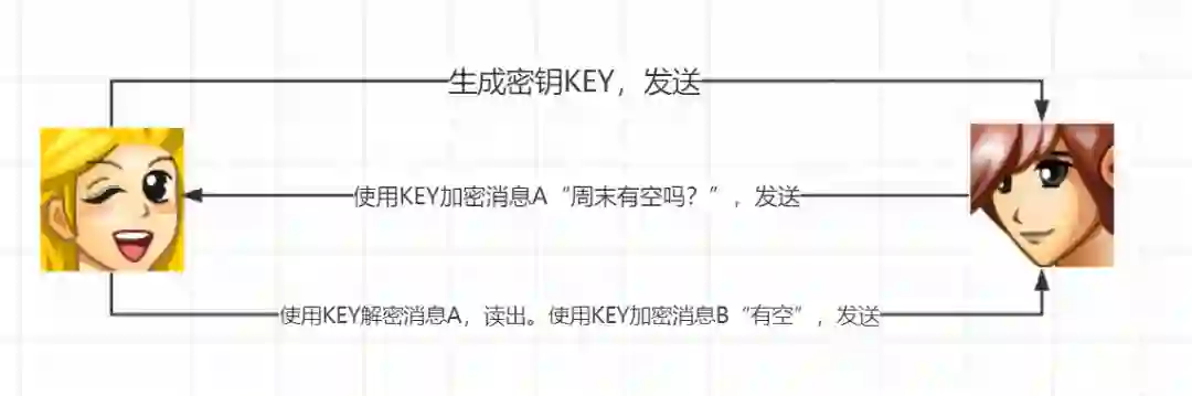如果使用非对称加密,首先服务器生成一对公钥和私钥,将公钥发送出去;对方收到公钥后,本地使用对称加密生成一个密钥KEY,然后使用公钥加密这个密钥KEY,发送;服务器收到公钥加密的数据后,使用私钥解密,得到KEY。这时,双方可以使用KEY来加密数据,开始安全地交流。 (即使中间人截获了公钥加密的数据,但是由于没有私钥(私钥只有签发公钥的服务器保管,不会用于传输)所以无法解密出KEY。)