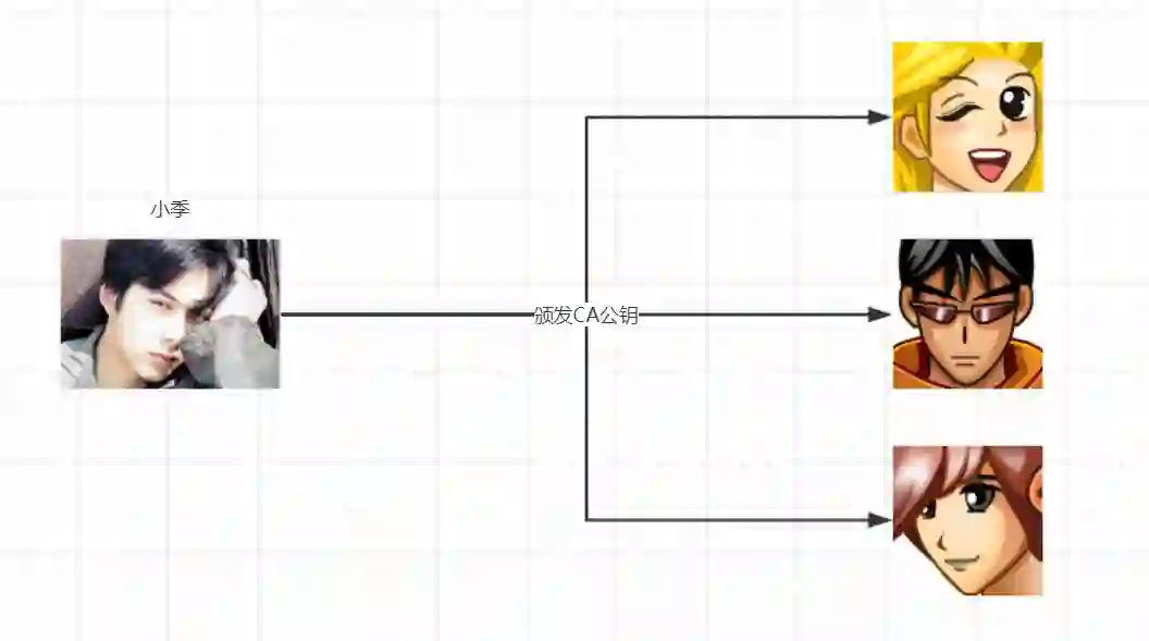 如果只是给公钥再对称加密或非对称加密的话,必定还是会衍生出鸡生蛋,蛋生鸡的问题。这该怎么办呢?此时,需要一个权威机构来主持大局。于是同学们决定推选德高望重的学生会主席小季(CA)来担此重任。