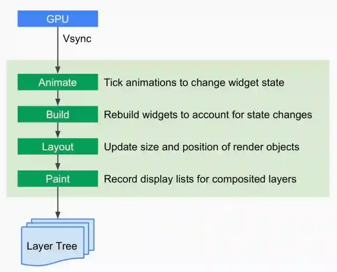当Root Isolate向Engine提交一次渲染帧时,Engine会等待下次vsync,当下次vsync到来时,由Root Isolate对Widgets进行布局操作,并生成页面的显示信息的描述,并将信息交给Engine去处理。