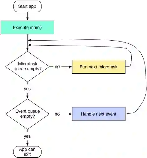 每个isolate包含一个事件循环以及两个事件队列,event loop事件循环,以及event queue和microtask queue事件队列,event和microtask队列有点类似iOS的source0和source1。