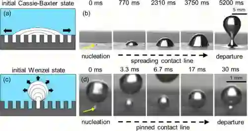 预湿润的超疏水表面结构,会在沸腾期间生成小气泡,也就是说它们不会沿着表面伸展。这些小气泡离开表面的时候不会合并成蒸气层,并且能够保持表面水润。疏水材料也能比亲水材料形成更多的小气泡,让表面更有效地冷却。