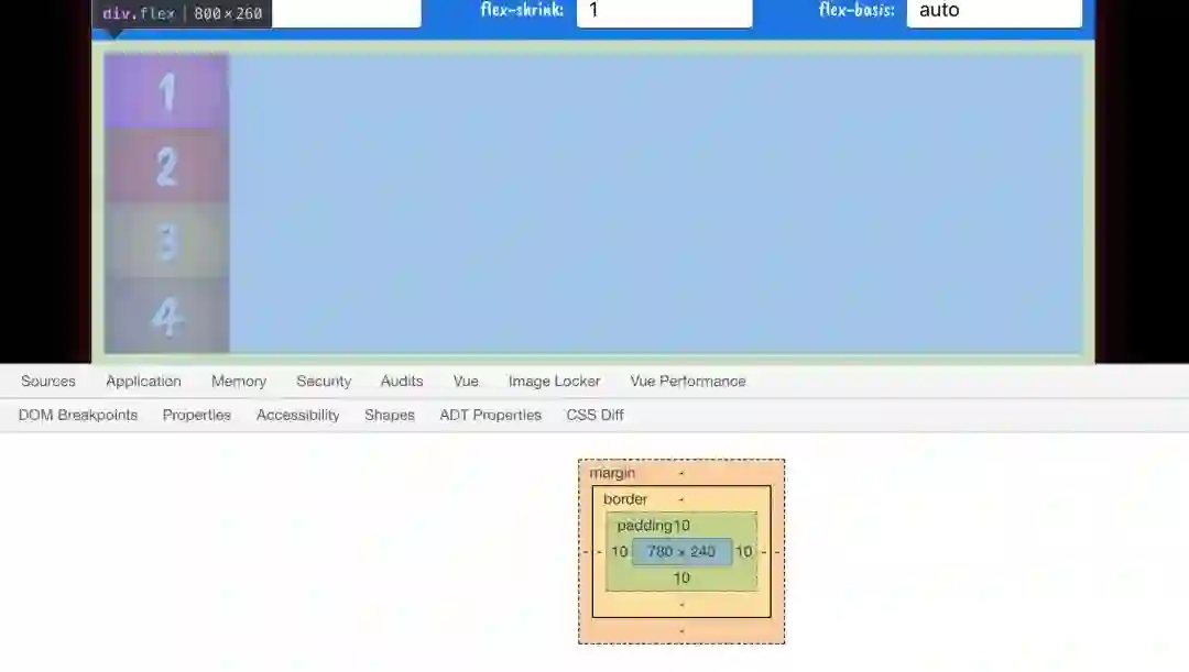 从上图的结果我们可以看出,当所有Flex项目的flex-shrink都设置为相同的值,比如1,将会均分Flex容器不足空间。比如此例,所有Flex项目的宽度总和是1200px(flex-basis: 300px),而Flex容器宽度是780px(width: 800px,padding: 10px,盒模型是border-box),可以算出Flex容器不足空间为420px(1200 - 780 = 420px),因为所有Flex项目的flex-shrink为1,其告诉浏览器,将Flex容器不足空间均分成四份,那么每份则是105px(420 / 4 = 105px),这个时候Flex项目就会自动缩放105px,其宽度就由当初的300px变成了195px(300 - 105 = 195px)。