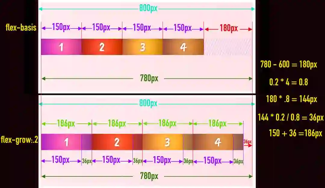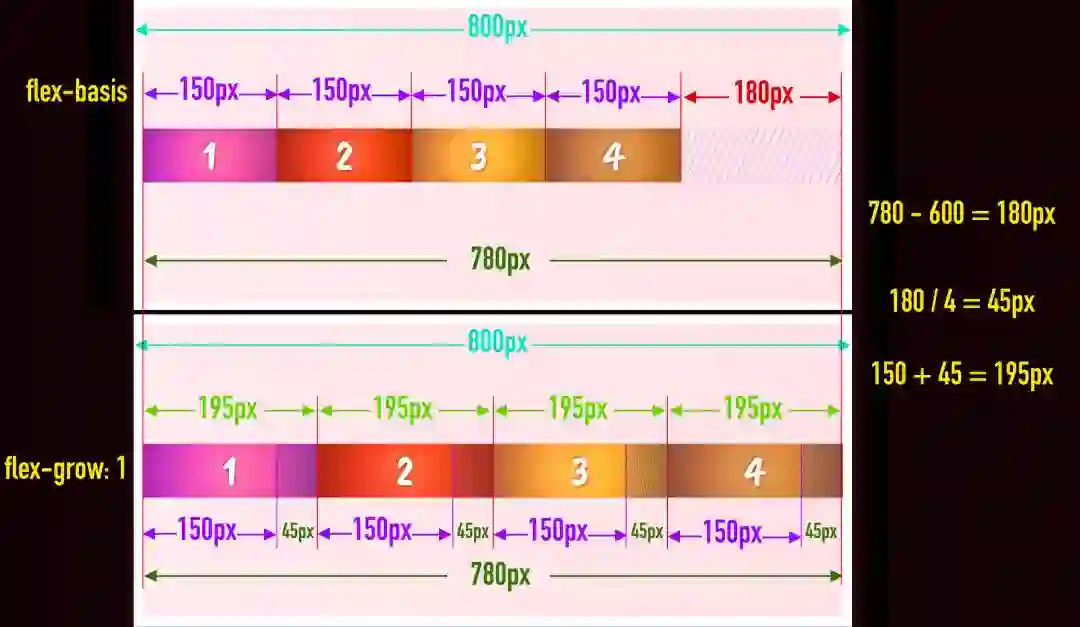 当所有的Flex项目具有一个相同的flex-grow值时,那么Flex项目将会平均分配Flex容器剩余的空间。在这种情况之下将flex-grow的值设置为1。比如下面这个示例,Flex容器(width: 800px,padding: 10px)中有四个子元素(Flex项目),显式的设置了flex-basis为150px,根据前面介绍的内容,我们可以知道每个Flex项目的宽度是150px,这样一来,所有Flex项目宽度总和为150px * 4 = 600px。容器的剩余空间为780px - 600px = 180px。当显式的给所有Flex项目设置了flex-grow为1(具有相同的值)。这样一来,其告诉浏览器,把Flex容器剩余的宽度(180px)平均分成了四份,即:180px / 4 = 45px。而flex-grow的特性就是按比例把Flex容器剩余空间分配给Flex项目(当然要设置了该值的Flex项目),就该例而言,就是给每个Flex项目添加了45px,也就是说,此时Flex项目的宽度从150px扩展到了195px(150px + 45px = 195px)。如下图所示: