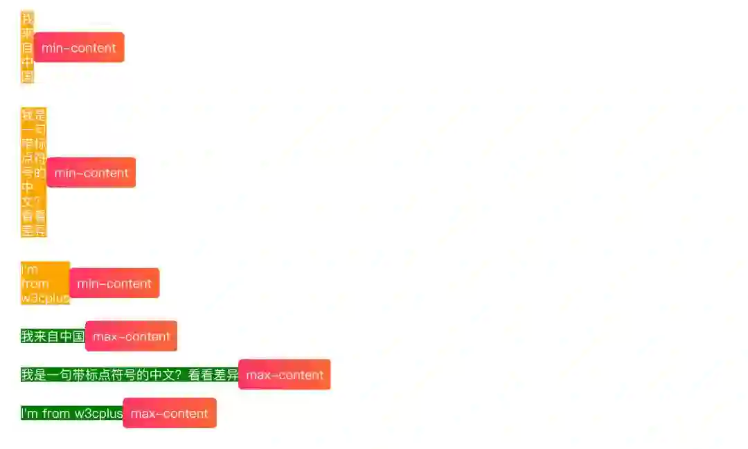 如果内容是英文的话,min-content的宽度将取决于内容中最长的单词宽度,中文就有点怪异(其中之因目前并未深究),而max-content则会计算内容排整行的宽度,有点类似于加上了white-space:nowrap一样。