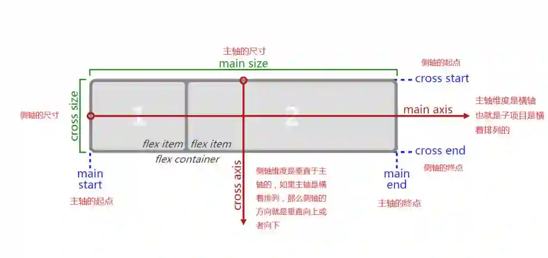 上面演示的是主轴在x轴方向,如果主轴变成y轴的方向,同样存在上述两种情形,只不过把width变成了height。接下来的内容中,如果没有特殊说明,那么所看到的示例都仅演示主轴在x轴的方向,即flex-direction为row!