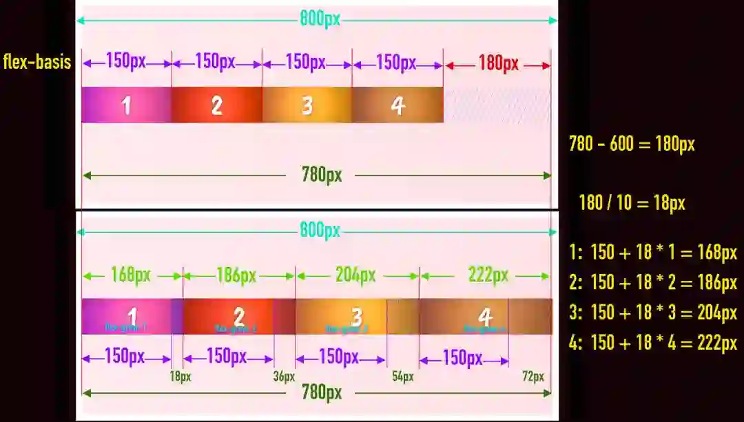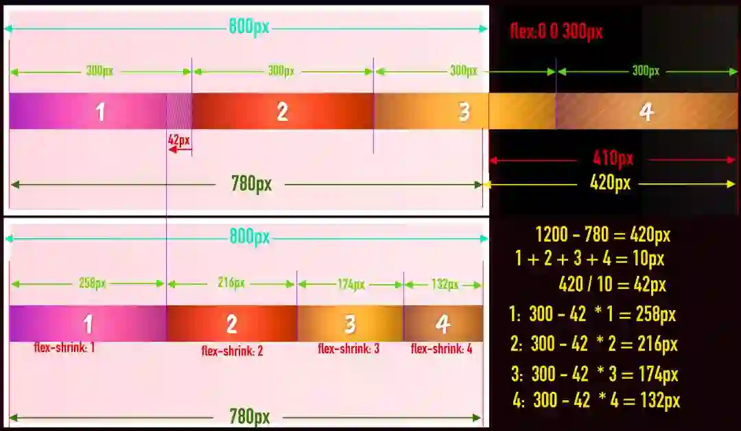 就上图而言,所有Flex项目的flex-shrink之和为10(1 + 2 + 3 + 4 = 10),此时把Flex容器不足空间420px分成了十份,每一份42px(420 / 10 = 42px),每个Flex项目按照自己的收缩因子相应的去收缩对应的宽度,此时每个Flex项目的宽度就变成: