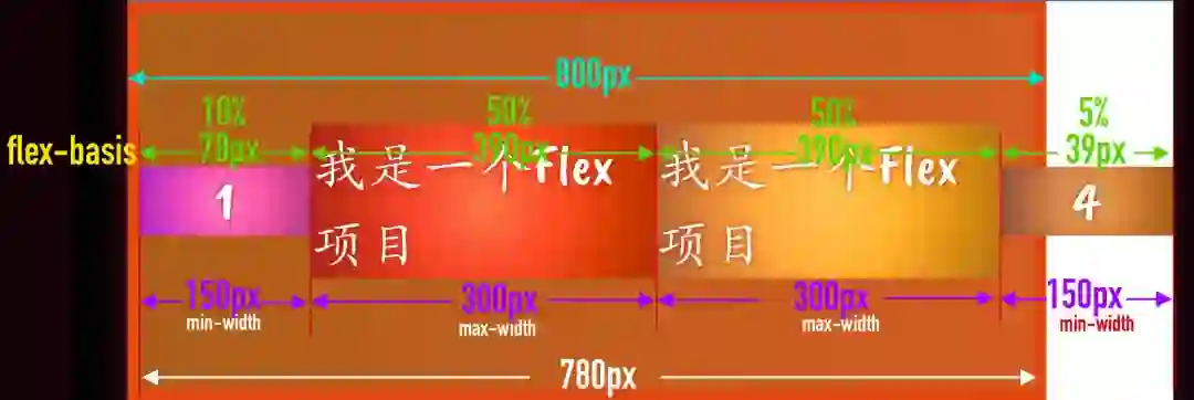 如果Flex项目显式的设置了min-width或max-width值时,当flex-basis计算出来的值小于min-width则按min-width值设置Flex项目宽度,反之,计算出来的值大于max-width值时,则按max-width的值设置Flex项目宽度
