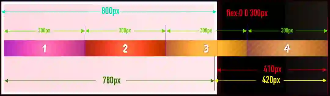 假设把Flex项目的width从100px调到300px,那么所有Flex项目的宽度总和就变成了300px * 4 = 1200px。这个时候Flex项目就溢出了Flex容器,这个溢出的宽度,即1200px - 780px = 420px。这个420px就是我们所说的Flex容器的不足空间: